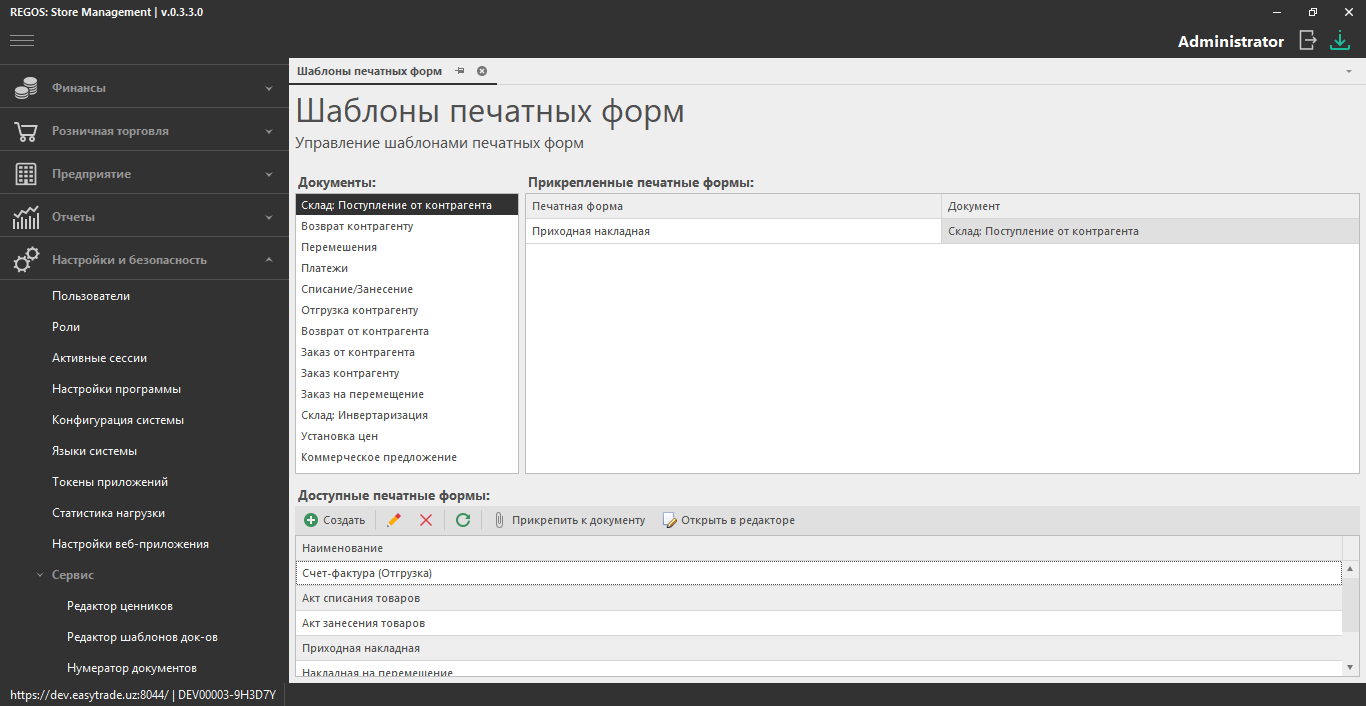 В главном окне отображается связь документов и печатных форм.