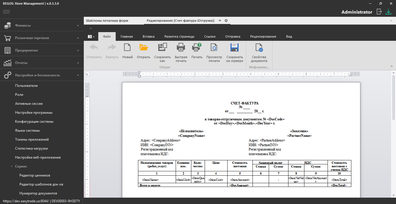 Каждый тип документа, создаваемый в REGOS имеет собственный шаблон с переменными.