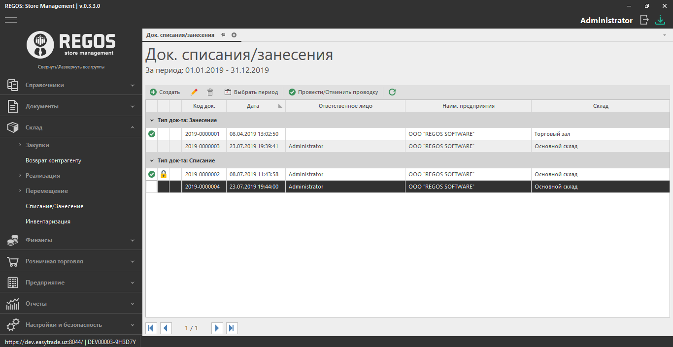 Раздел управления документами списания номенклатуры со склада и занесения номенклатуры на склад.