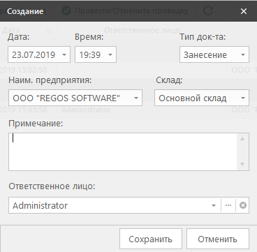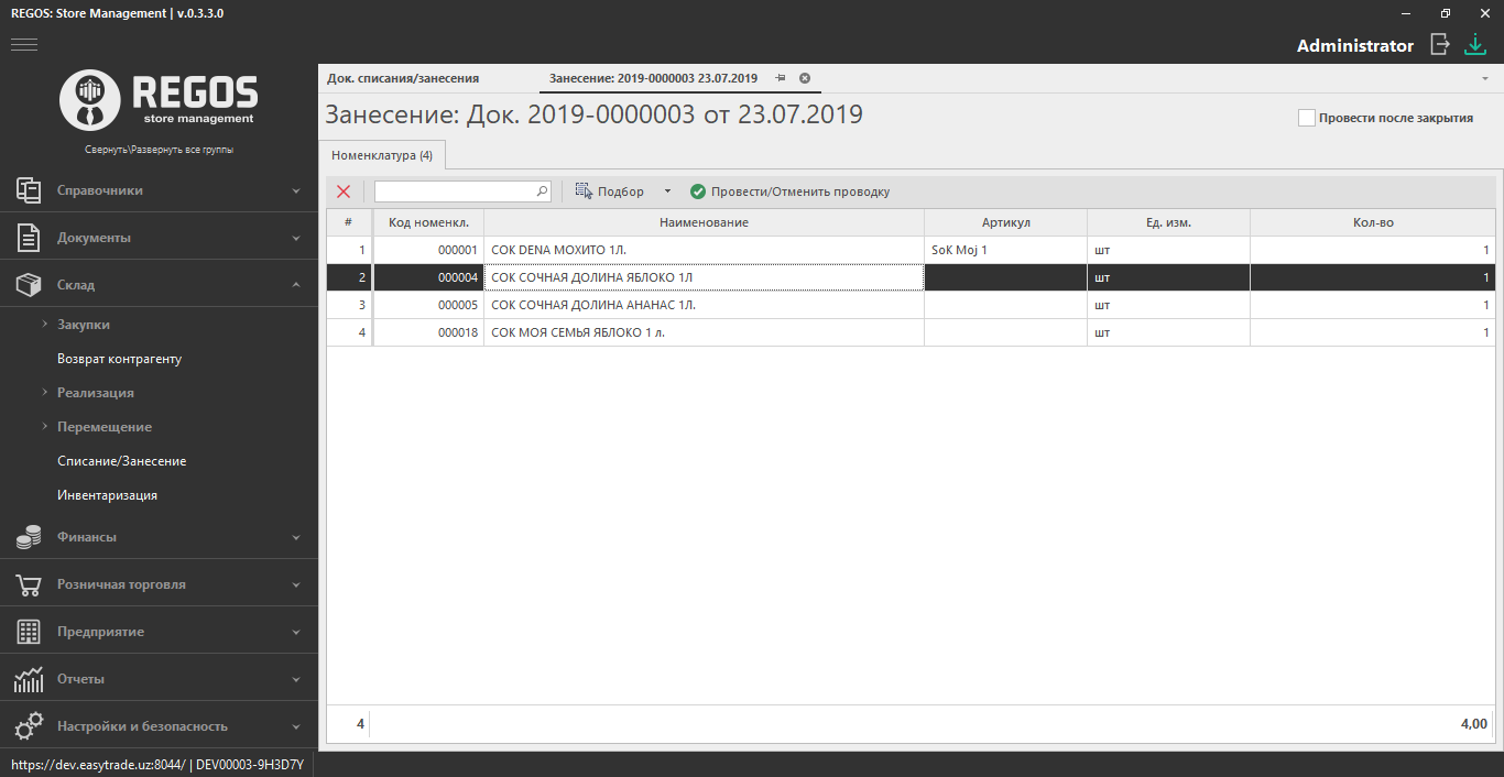 После создания документа списания или занесения, необходимо его открыть и заполнить.