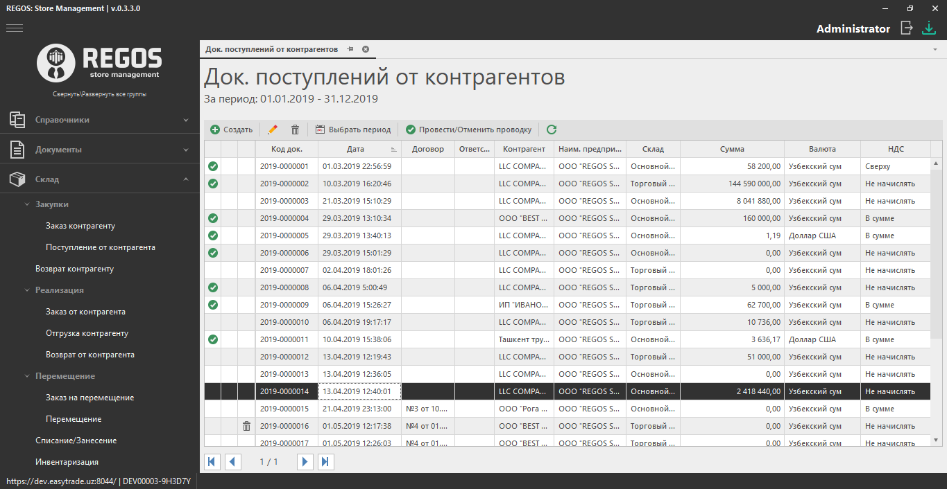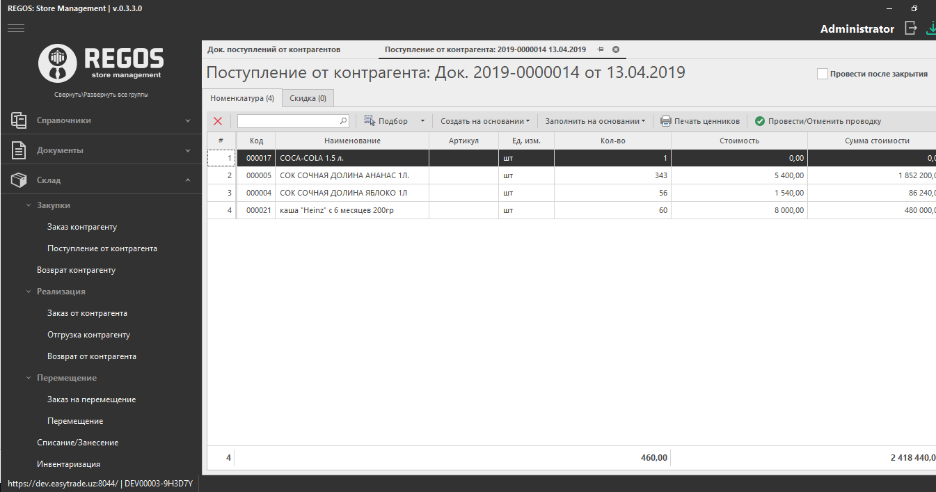 Созданные документы поступлений от контрагентов необходимо проводить.