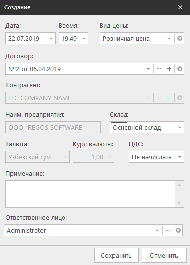 - Договор - при указании договора с контрагентом, все остальные поля будут заполнены автоматически;