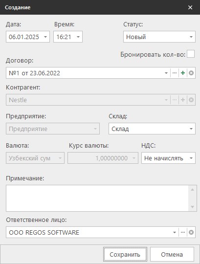 - Договор - Договор, на основании которого от контрагента поступает заказ. Если договор указан, то параметры: Контрагент, Предприятие, Валюта и Курс валюты берутся из указанного договора и не доступны для редактирования;
