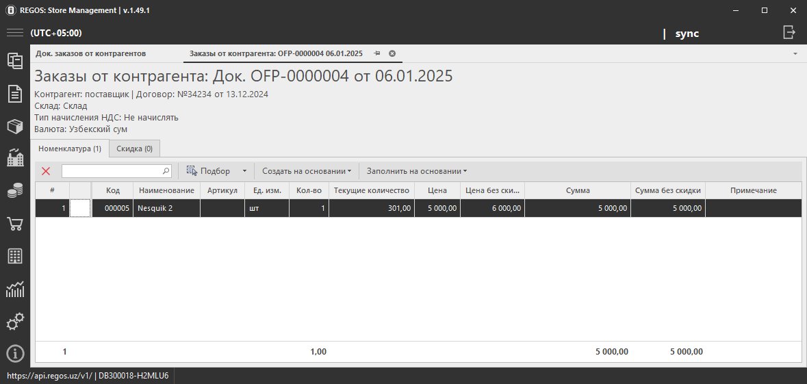 - Удалить - Удаление выделенного документа заказа от контрагента;