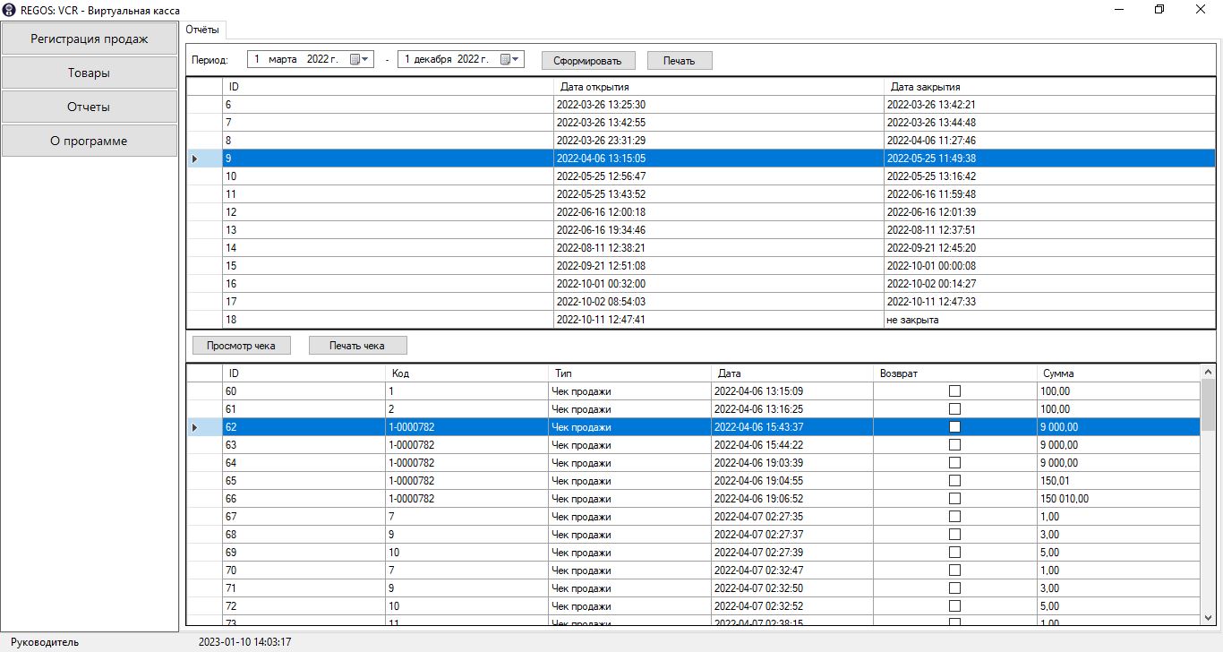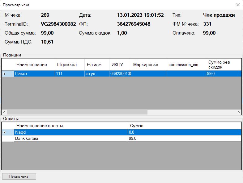| Просмотр чека | открывает выбранный чек отдельном окне для просмотра и позволяет напечатать его |