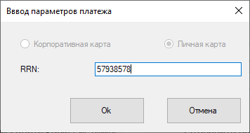 Если оплата осуществилась через терминал, то появится окно, в котором заполняется значение RRN из чека терминала или фискльного чека.