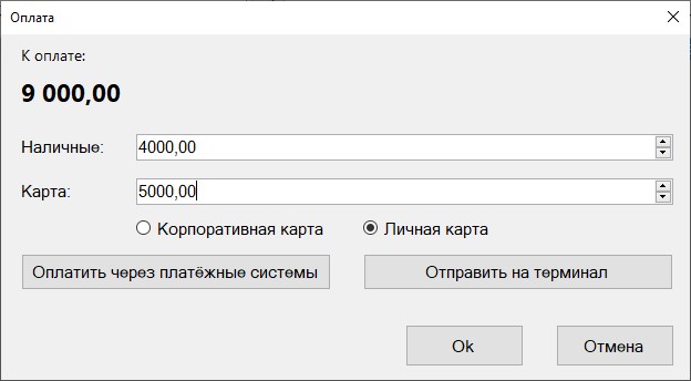 Примечание: Оплате через платёжные системы заносится как оплата картой, при этом карта считается личной.