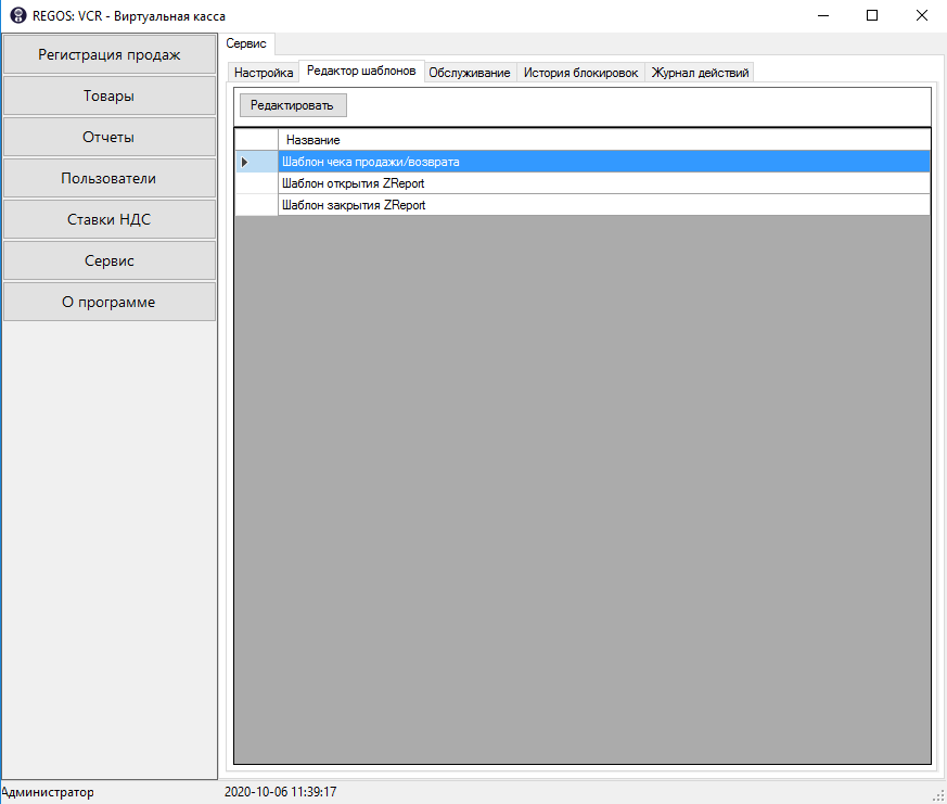 Раздел содержит редактор шаблонов фискальных чеков, используемых в работе REGOS: VCR.