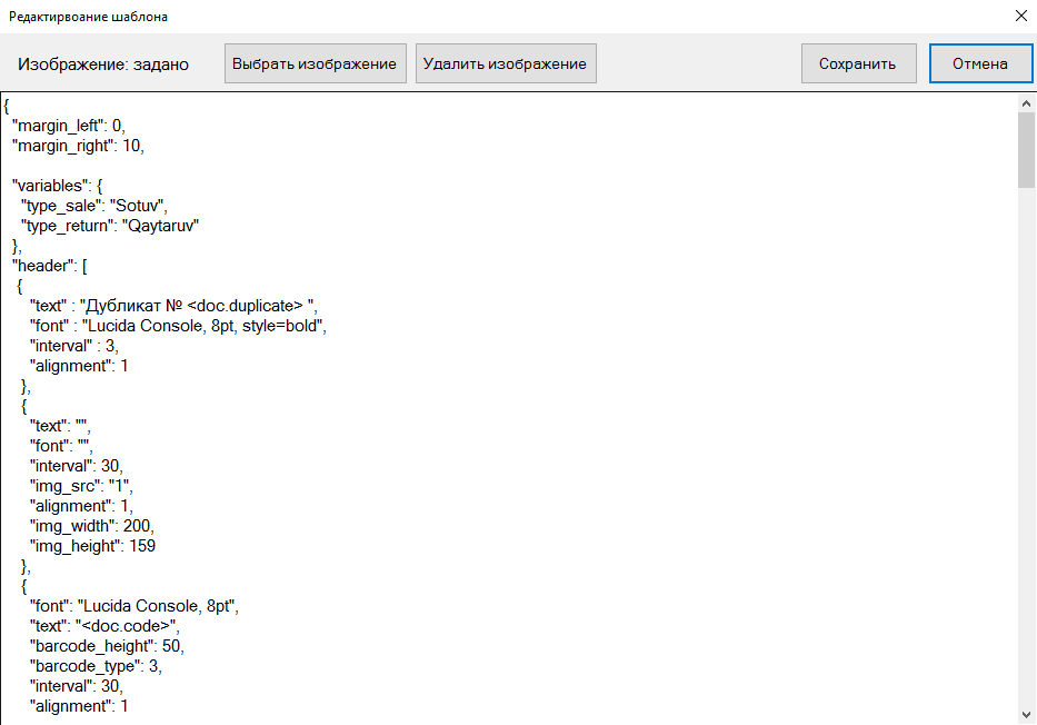 В шаблоне можно задать размер и тип шрифта, используемый при печати чека, а также задать изображение в заголовке чека.
